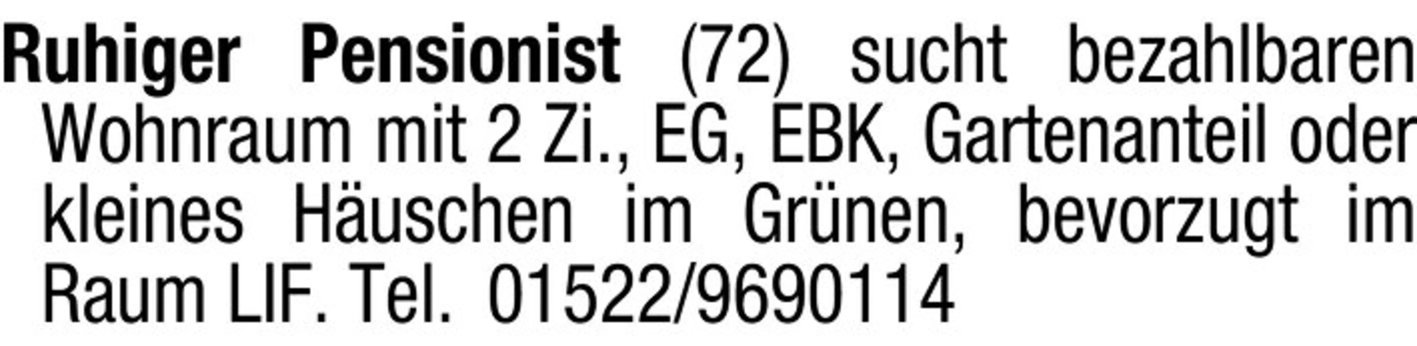 Ruhiger Pensionist (72) sucht bezahlbaren Wohnraum mit 2 Zi., EG, EBK, Gartenanteil oder kleines Huschen im Grnen, bevorzugt im Raum LIF. Tel. 01522/9690114
