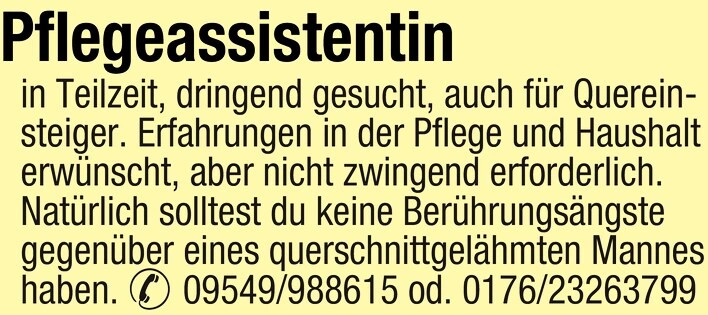 Pflegeassistentin Teilzeit für Querschnittsgelähmten gesucht