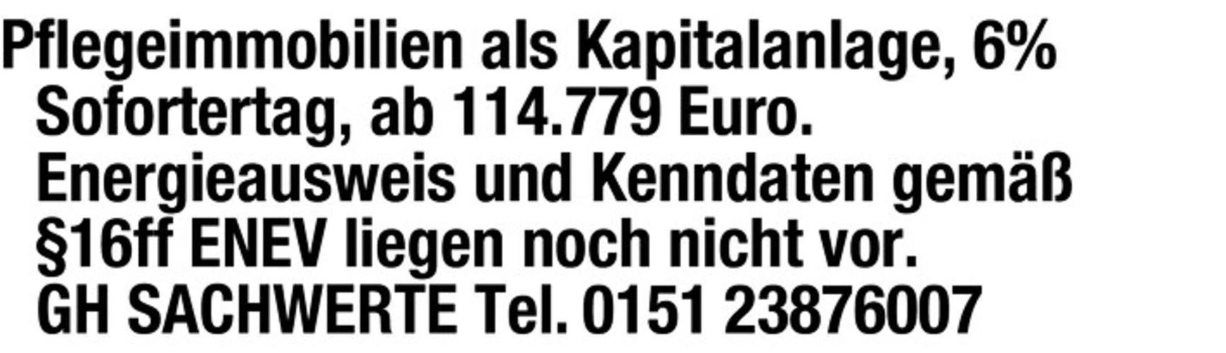 Pflegeimmobilien als Kapitalanlage, 6% Sofortertag, ab 114.779 Euro. Energieausweis und Kenndaten gem 16ff ENEV liegen noch nicht vor. GH SACHWERTE Tel. 0151 23876007