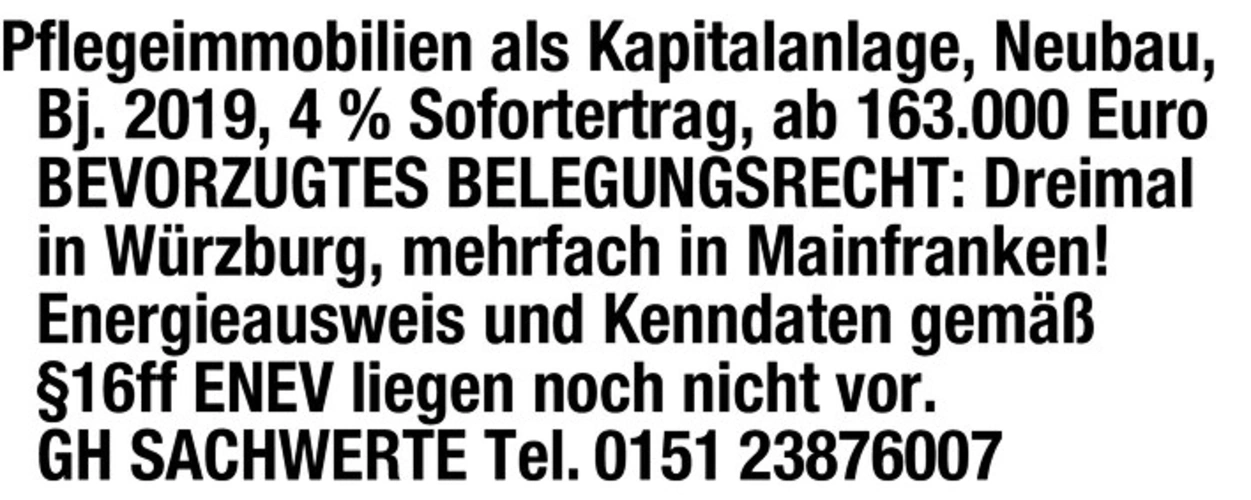 Pflegeimmobilien als Kapitalanlage, Neubau, Bj. 2019, 4 % Sofortertrag, ab 163.000 Euro BEVORZUGTES BELEGUNGSRECHT: Dreimal in Wrzburg, mehrfach in Mainfranken! Energieausweis und Kenndaten gem 16ff ENEV liegen noch nicht vor. GH SACHWERTE Tel. 0151 23876007