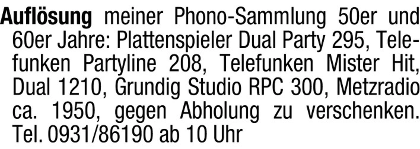text Auflsung meiner Phono-Sammlung 50er und 60er Jahre: Plattenspieler Dual Party 295, Telefunken Partyline 208, Telefunken Mister Hit, Dual 1210, Grundig Studio RPC 300, Metzradio ca. 1950, gegen Abholung zu verschenken. Tel. 0931/86190 ab 10 Uhr