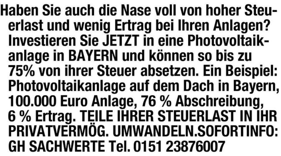 markdown Haben Sie auch die Nase voll von hoher Steuerlast und wenig Ertrag bei Ihren Anlagen? Investieren Sie JETZT in eine Photovoltaikanlage in BAYERN und knnen so bis zu 75% von ihrer Steuer absetzen. Ein Beispiel: Photovoltaikanlage auf dem Dach in Bayern, 100.000 Euro Anlage, 76 % Abschreibung,6 % Ertrag. TEILE IHRER STEUERLAST IN IHR PRIVATVERMG. UMWANDELN.SOFORTINFO:GH SACHWERTE Tel. 0151 23876007
