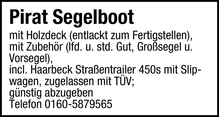 Pirat Segelboot mit Holzdeck (entlackt zum Fertigstellen), mit Zubehör (lfd. u. std. Gut, Großsegel u. Vorsegel), incl. Haarbeck Straßentrailer 450s mit Slipwagen, zugelassen mit TÜV; günstig abzugeben