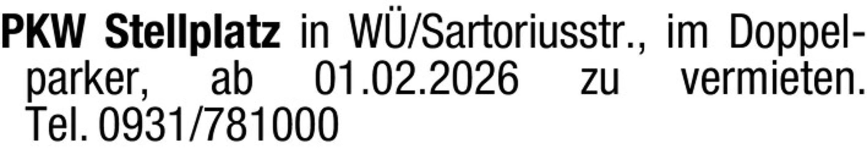 PKW Stellplatz in W/Sartoriusstr., im Doppelparker, ab 01.02.2026 zu vermieten. Tel. 0931/781000