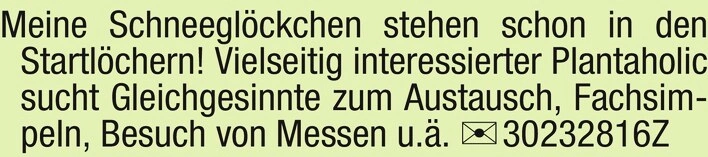Meine Schneeglckchen stehen schon in den Startlchern! Vielseitig interessierter Plantaholic sucht Gleichgesinnte zum Austausch, Fachsimpeln, Besuch von Messen u.. Chiffre 30232816