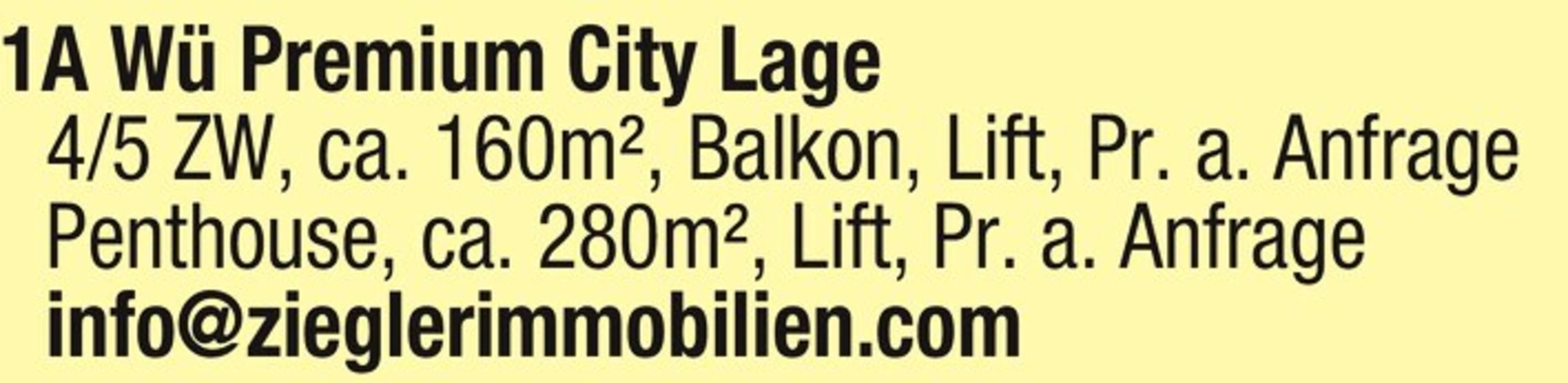 1A W Premium City Lage 4/5 ZW, ca. 160m, Balkon, Lift, Pr. a. Anfrage Penthouse, ca. 280m, Lift, Pr. a. Anfrage info@zieglerimmobilien.com