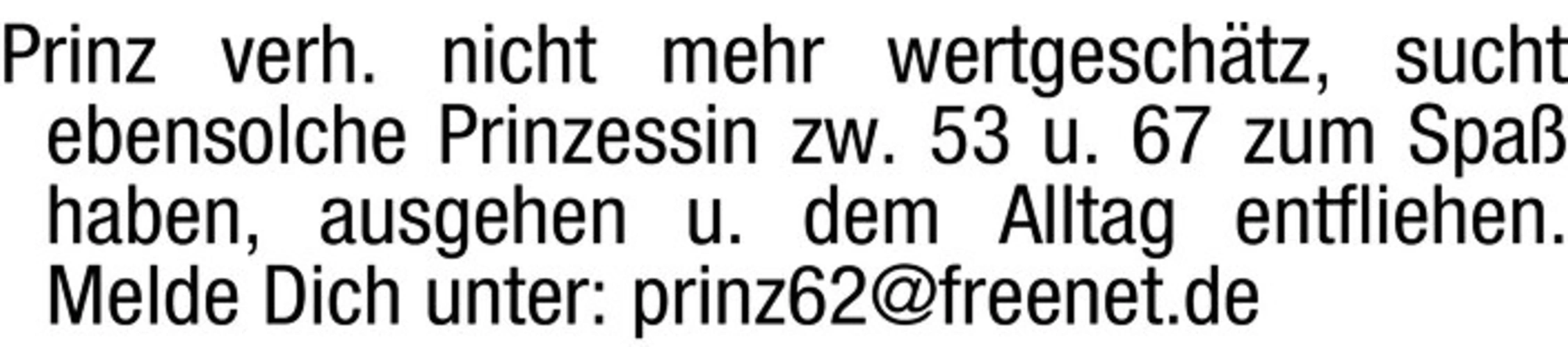 Prinz verh. nicht mehr wertgeschätzt, sucht ebensolche Prinzessin zw. 53 u. 67 zum Spa haben, ausgehen u. dem Alltag entfliehen.