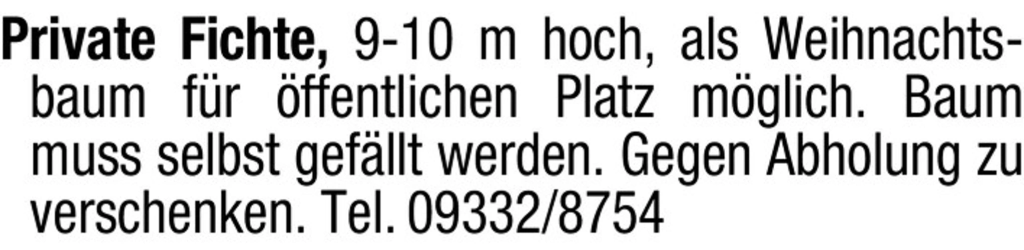 Private Fichte, 9-10 m hoch, als Weihnachtsbaum für öffentlichen Platz möglich. Baum muss selbst gefällt werden. Gegen Abholung zu verschenken. Tel. 09332/8754