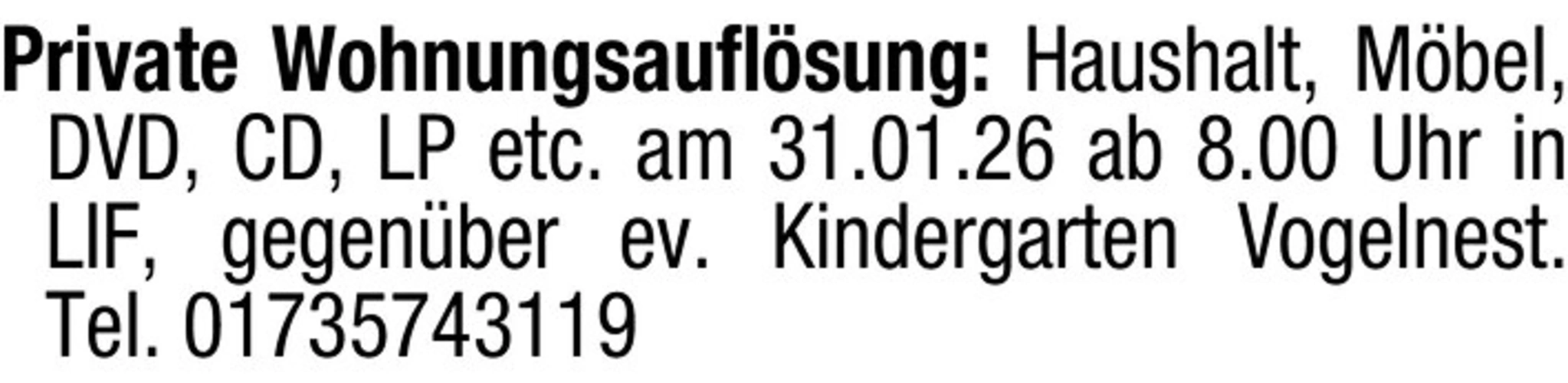 text Private Wohnungsauflsung: Haushalt, Mbel, DVD, CD, LP etc. am 31.01.26 ab 8.00 Uhr in LIF, gegenber ev. Kindergarten Vogelnest. Tel. 01735743119