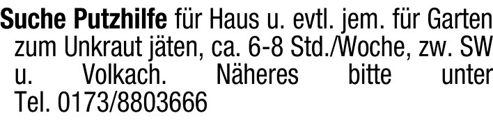 Suche Putzhilfe für Haus und eventuell jemanden für Garten zum Unkrautjäten
