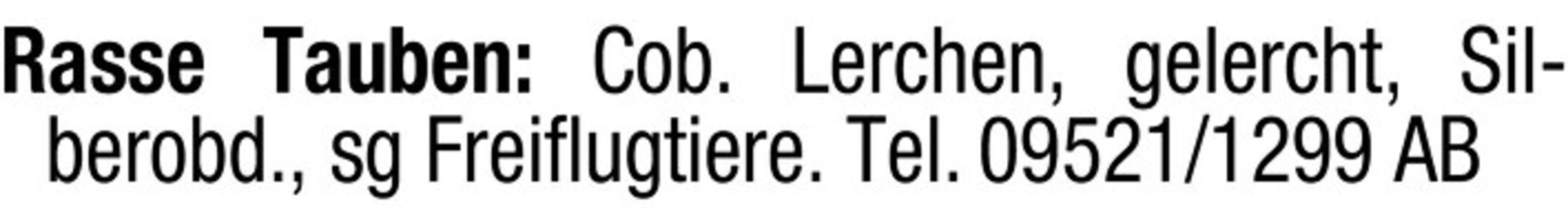 Rassetauben: Cob. Lerchen und Silberobd. Freiflugtiere, Tel. 09521/1299 AB