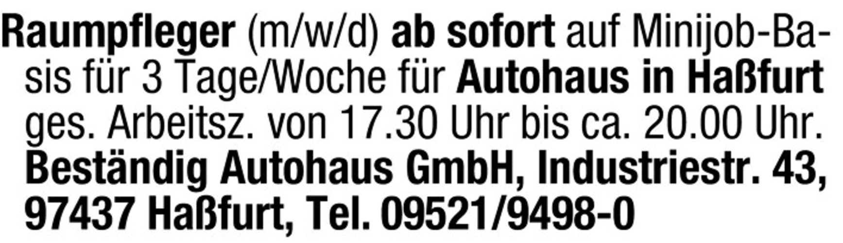 Raumpfleger (m/w/d) ab sofort auf Minijob-Basis für 3 Tage/Woche für Autohaus in Haßfurt gesucht.