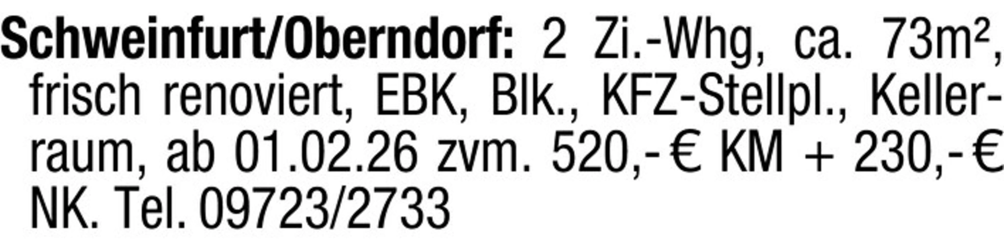 Schweinfurt/Oberndorf: 2 Zi.-Whg, ca. 73m, frisch renoviert, EBK, Blk., KFZ-Stellpl., Kellerraum, ab 01.02.26 zvm. 520,- KM 230,- NK. Tel. 09723/2733