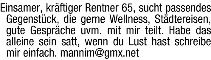 Einsamer, kräftiger Rentner 65, sucht passendes Gegenstück, die gerne Wellness, Städtereisen, gute Gespräche uvm. mit mir teilt.