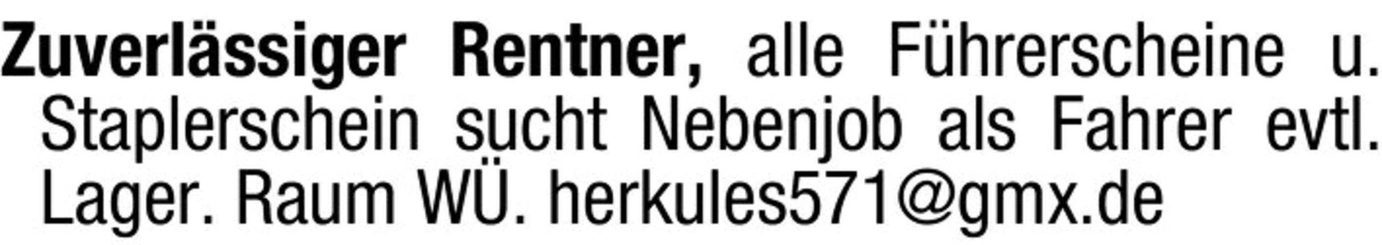 Zuverlässiger Rentner, alle Führerscheine und Staplerschein sucht Nebenjob als Fahrer, eventuell Lager.