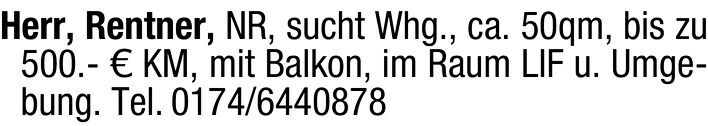 Herr, Rentner, NR, sucht Whg., ca. 50qm, bis zu 500.- KM, mit Balkon, im Raum LIF u. Umgebung.