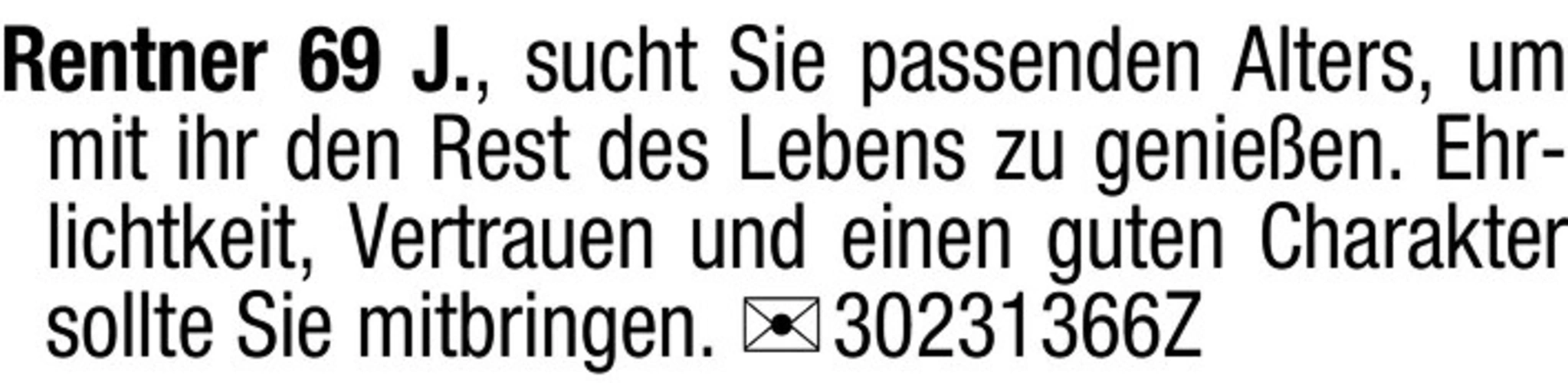 Rentner 69 J., sucht Sie passenden Alters, um mit ihr den Rest des Lebens zu genießen. Ehrlichkeit, Vertrauen und einen guten Charakter sollte Sie mitbringen. Chiffre 30231366