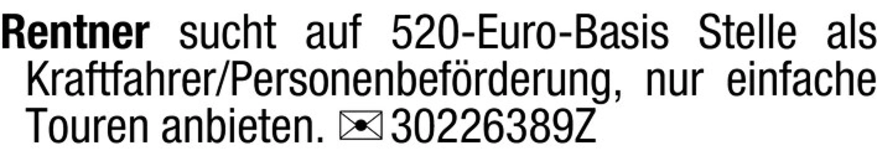 Rentner sucht auf 520-Euro-Basis Stelle als Kraftfahrer/Personenbeförderung, nur einfache Touren anbieten. Chiffre 30226389