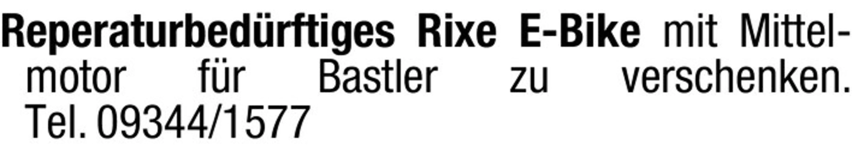 Reperaturbedrftiges Rixe E-Bike mit Mittelmotor fr Bastler zu verschenken. Tel: 09344/1577