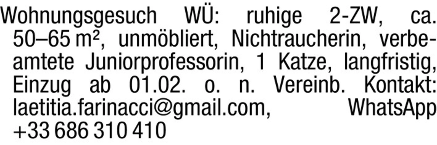 Wohnungsgesuch W: ruhige 2-ZW, ca. 50-65 m, unmbliert, Nichtraucherin, verbeamtete Juniorprofessorin, 1 Katze, langfristig, Einzug ab 01.02. o. n. Vereinb. Kontakt: laetitia.farinacci@gmail.com, WhatsApp 33 686 310 410