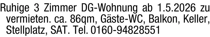 Ruhige 3 Zimmer DG-Wohnung ab 1.5.2026 zu vermieten. ca. 86qm, Gste-WC, Balkon, Keller, Stellplatz, SAT. Tel. 0160-94828551