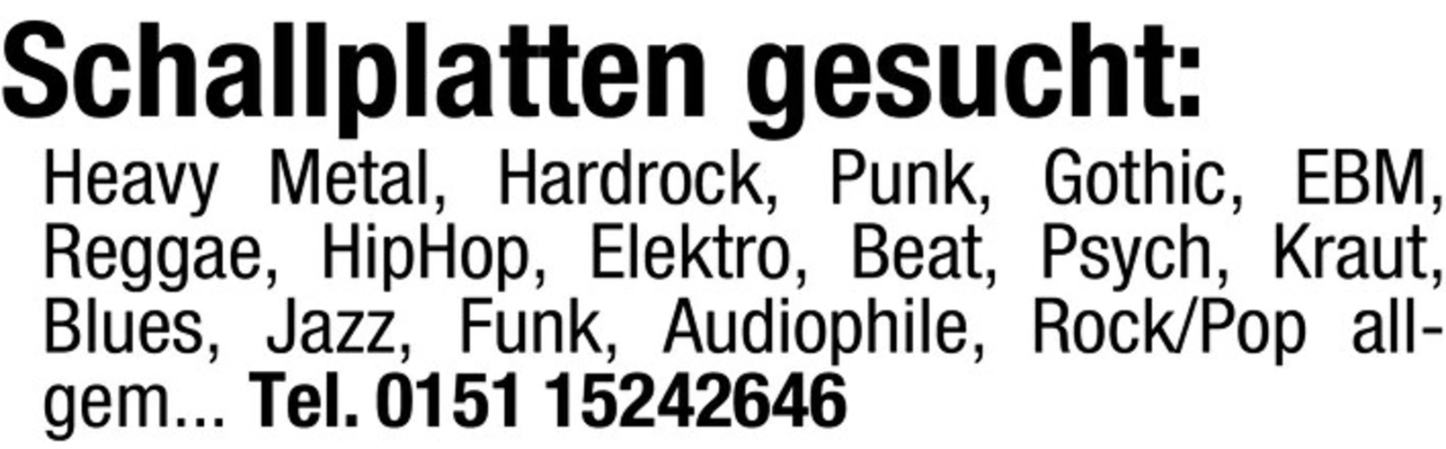 Schallplatten gesucht: Heavy Metal, Hardrock, Punk, Gothic, EBM, Reggae, HipHop, Elektro, Beat, Psych, Kraut, Blues, Jazz, Funk, Audiophile, Rock/Pop allgem...