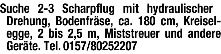 Suche 2-3 Scharpflug mit hydraulischer Drehung, Bodenfrse, ca. 180 cm, Kreisel-egge, 2 bis 2,5 m, Miststreuer und andere Gerte.