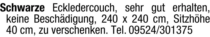 Schwarze Eckledercouch, sehr gut erhalten, keine Beschädigung, 240 x 240 cm, Sitzhöhe 40 cm, zu verschenken.