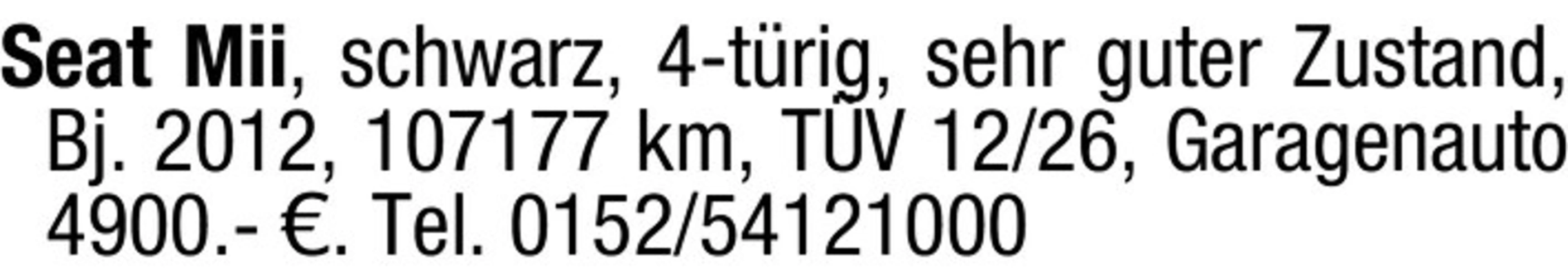 Seat Mii, schwarz, 4-trig, sehr guter Zustand, Bj. 2012, 107177 km, TV 12/26, Garagenauto 4900.- . Tel. 0152/54121000