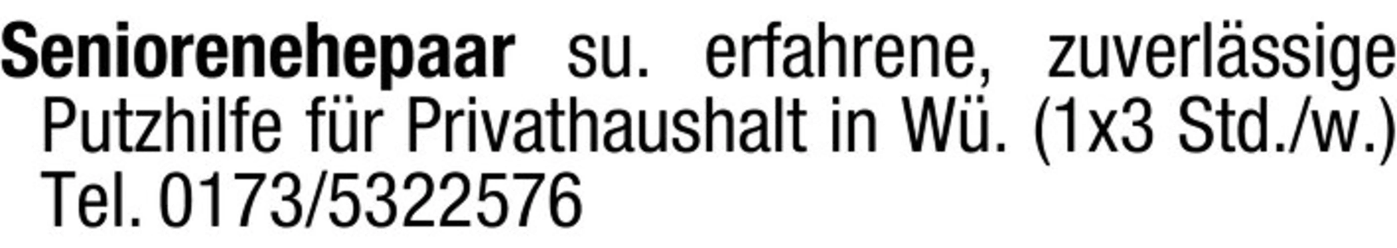 text Seniorenehepaar su. erfahrene, zuverlssige Putzhilfe fr Privathaushalt in W. (1x3 Std./w.) Tel. 0173/5322576