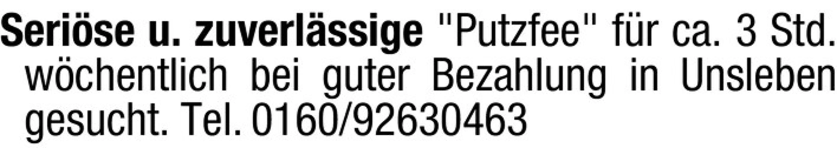 text Serise u. zuverlssige "Putzfee" fr ca. 3 Std. wchentlich bei guter Bezahlung in Unsleben gesucht. Tel. 0160/92630463