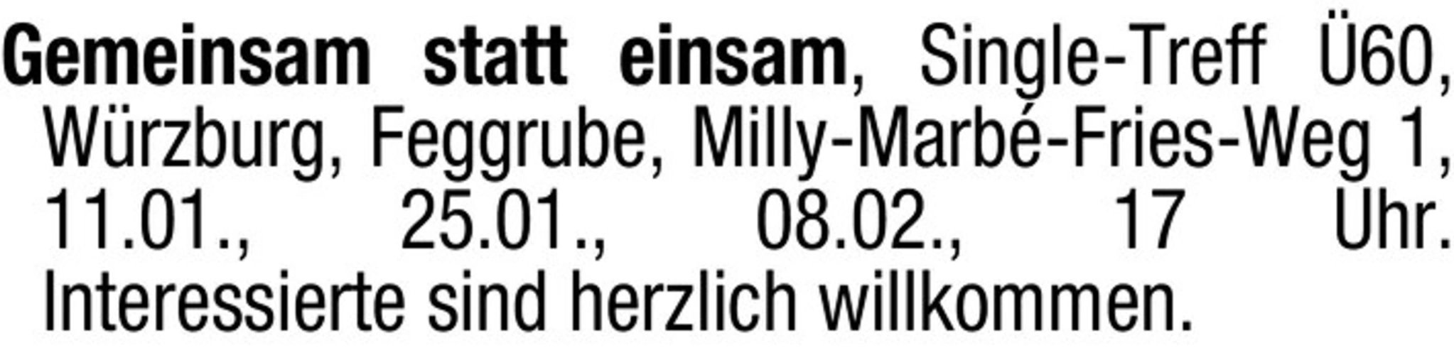 text Gemeinsam statt einsam, Single-Treff 60, Wrzburg, Feggrube, Milly-Marb-Fries-Weg 1, 11.01., 25.01., 08.02., 17 Uhr. Interessierte sind herzlich willkommen.
