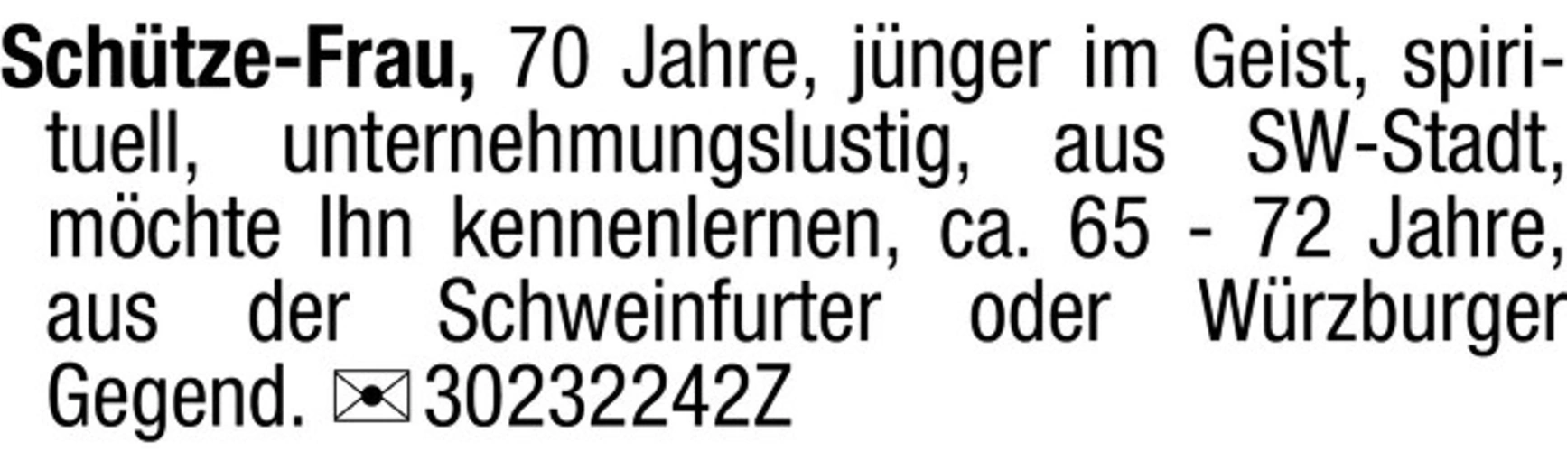 Schtze-Frau, 70 Jahre, jnger im Geist, spirituell, unternehmungslustig, aus SW-Stadt, mchte Ihn kennenlernen, ca. 65 - 72 Jahre, aus der Schweinfurter oder Wrzburger Gegend. Chiffre 30232242