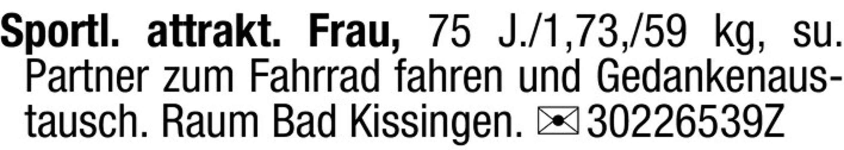 Sportl. attraktive Frau, 75 J./1,73,/59 kg, sucht Partner zum Fahrrad fahren und Gedankenaustausch. Raum Bad Kissingen. Chiffre 30226539