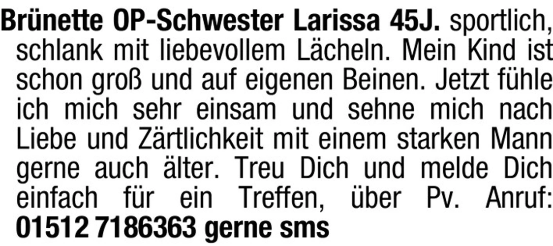 Mein Kind ist schon groß und auf eigenen Beinen. Jetzt fühle ich mich sehr einsam und sehne mich nach Liebe und Zärtlichkeit mit einem starken Mann, gerne auch älter. Treu dich und melde dich einfach für ein Treffen, über PV.