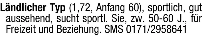 Ländlicher Typ (1,72, Anfang 60), sportlich, gut aussehend, sucht sportl. Sie, zw. 50-60 J., für Freizeit und Beziehung.