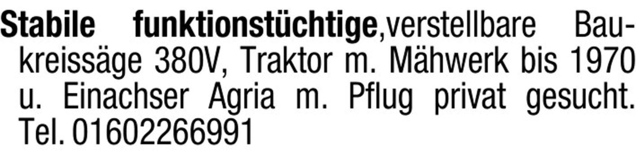 Stabile, funktionstüchtige, verstellbare Baukreissäge 380V, Traktor mit Mähwerk bis 1970 und Einachser Agria mit Pflug privat gesucht.