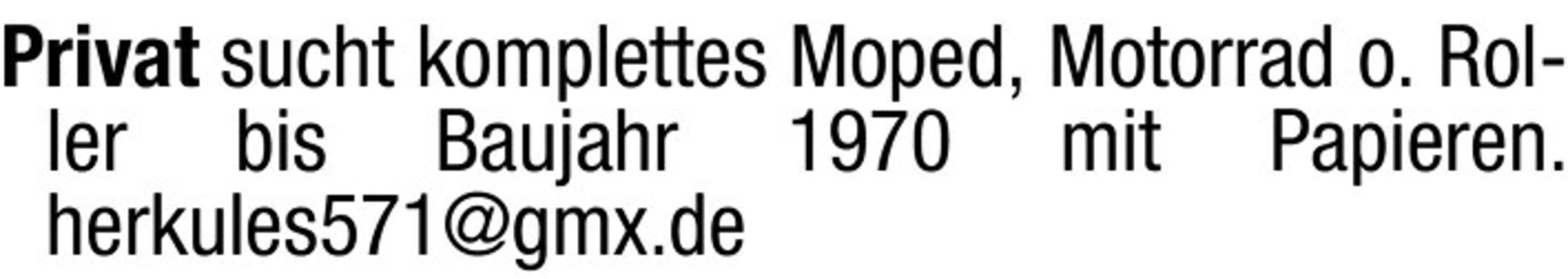 Privat sucht komplettes Moped, Motorrad o. Roller bis Baujahr 1970 mit Papieren.