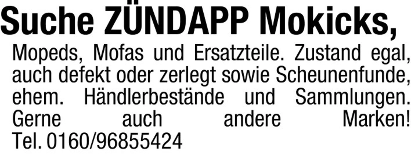 Suche ZNDAPP Mokicks, Mopeds, Mofas und Ersatzteile. Zustand egal, auch defekt oder zerlegt sowie Scheunenfunde, ehem. Hndlerbestände und Sammlungen. Gerne auch andere Marken!