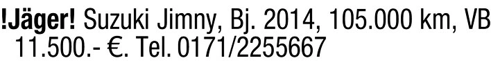 !Jger! Suzuki Jimny, Bj. 2014, 105.000 km, VB 11.500.- . Tel. 0171/2255667