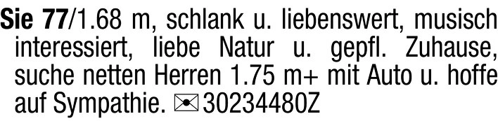 Sie 77/1.68 m, schlank u. liebenswert, musisch interessiert, liebe Natur u. gepfl. Zuhause, suche netten Herren 1.75 m+ mit Auto u. hoffe auf Sympathie. Chiffre 30234480