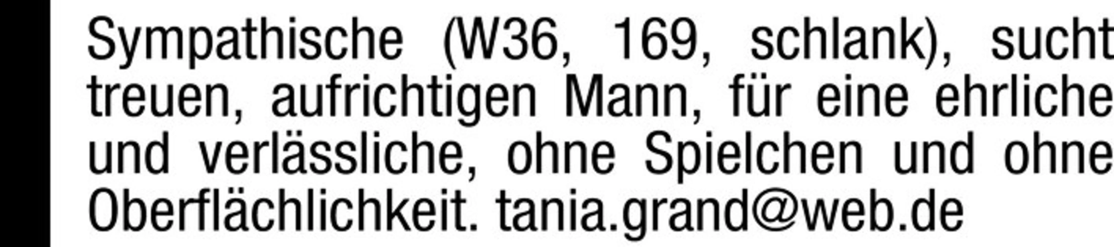 Sympathische (W36, 169, schlank), sucht treuen, aufrichtigen Mann, für eine ehrliche und verlässliche, ohne Spielchen und ohne Oberflächlichkeit.