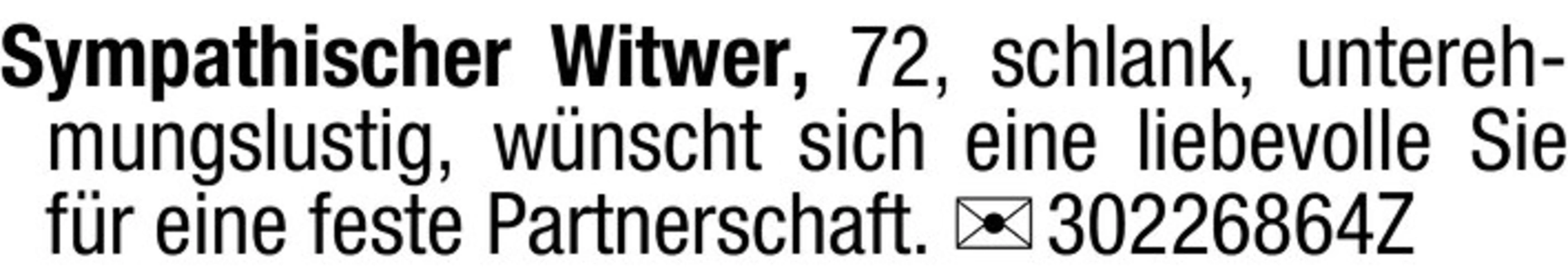 Sympathischer Witwer, 72, schlank, unternehmungslustig, wünscht sich eine liebevolle Sie für eine feste Partnerschaft. Chiffre 30226864