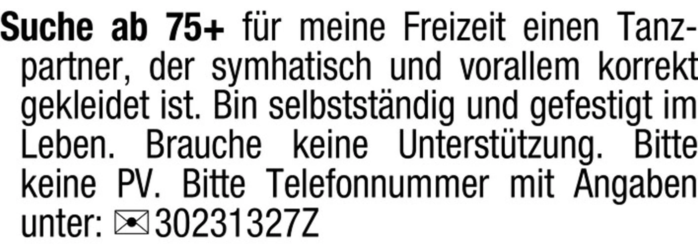 Suche ab 75 für meine Freizeit einen Tanzpartner, der symphatisch und vor allem korrekt gekleidet ist. Bin selbstständig und gefestigt im Leben. Brauche keine Unterstützung. Bitte keine PV. Bitte Telefonnummer mit Angaben unter: Chiffre 30231327