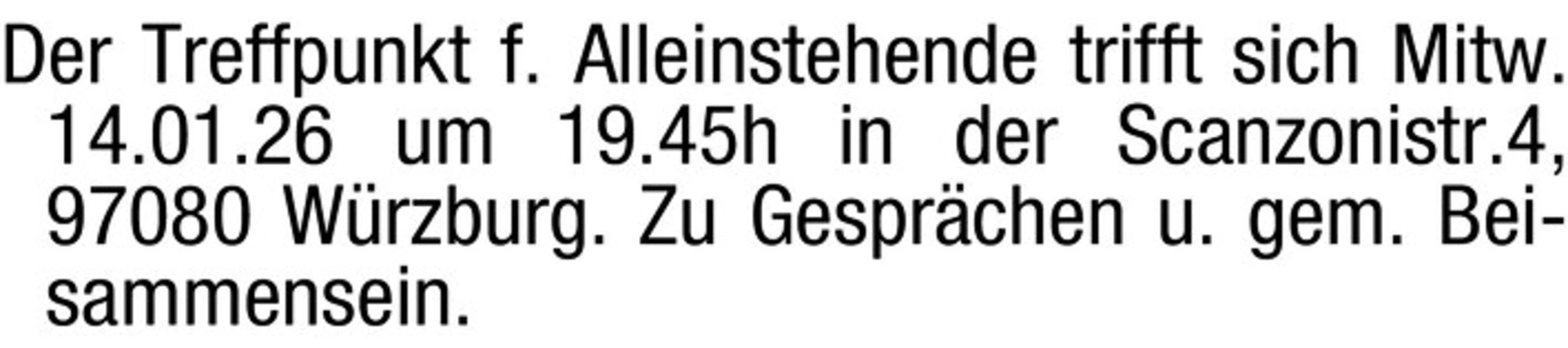 Der Treffpunkt f. Alleinstehende trifft sich Mitw. 14.01.26 um 19.45h in der Scanzonistr.4, 97080 Wrzburg. Zu Gesprchen u. gem. Beisammensein.