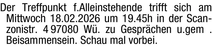 Der Treffpunkt f. Alleinstehende trifft sich am Mittwoch 18.02.2026 um 19.45h in der Scanzonistr. 4 97080 W. zu Gesprächen u. gem. Beisammensein. Schau mal vorbei.