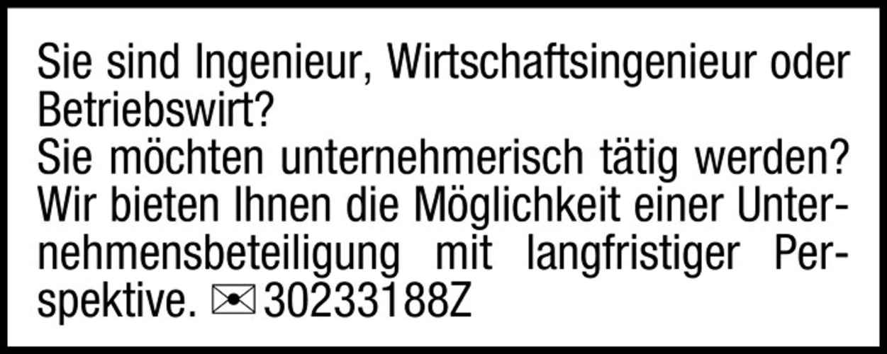 Sie sind Ingenieur, Wirtschaftsingenieur oder Betriebswirt?Sie mchten unternehmerisch ttig werden?Wir bieten Ihnen die Mglichkeit einer Unternehmensbeteiligung mit langfristiger Perspektive. Chiffre 30233188