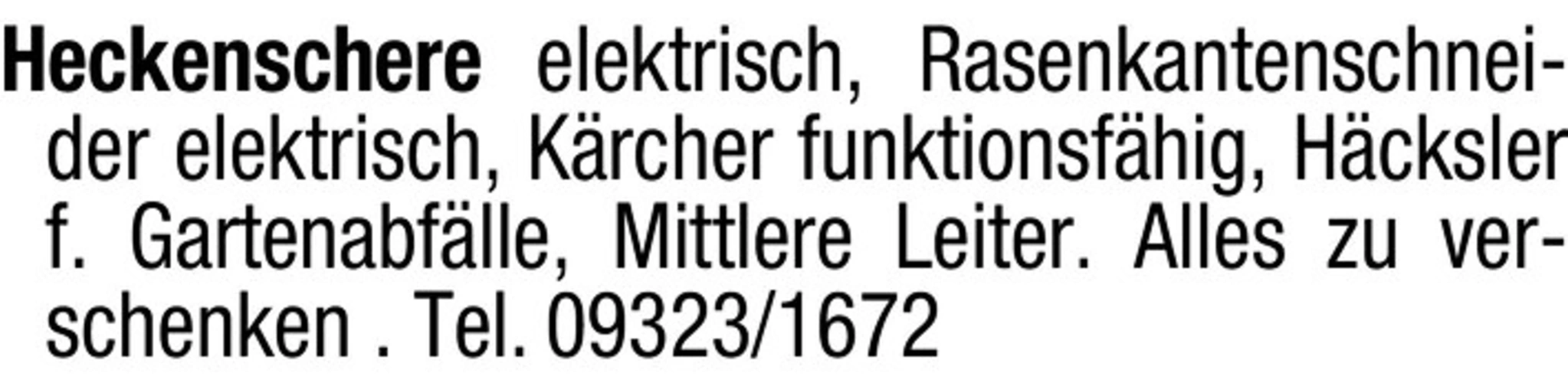 text Heckenschere elektrisch, Rasenkantenschneider elektrisch, Krcher funktionsfhig, Hcksler f. Gartenabflle, Mittlere Leiter. Alles zu verschenken . Tel. 09323/1672