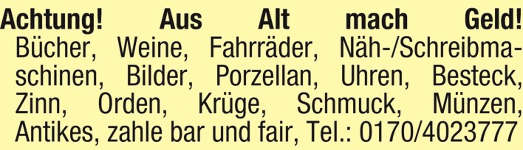 Bücher, Weine, Fahrräder, Näh-/Schreibmaschinen, Bilder, Porzellan, Uhren, Besteck, Zinn, Orden, Krüge, Schmuck, Münzen, Antikes,