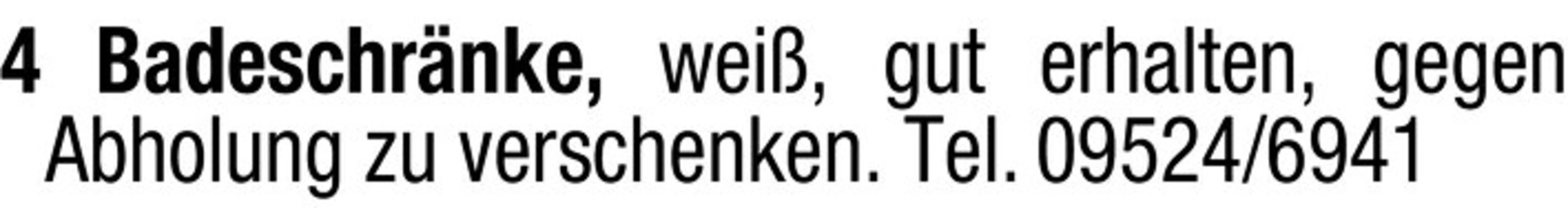 4 Badeschrnke, wei, gut erhalten, gegen Abholung zu verschenken. Tel. 09524/6941